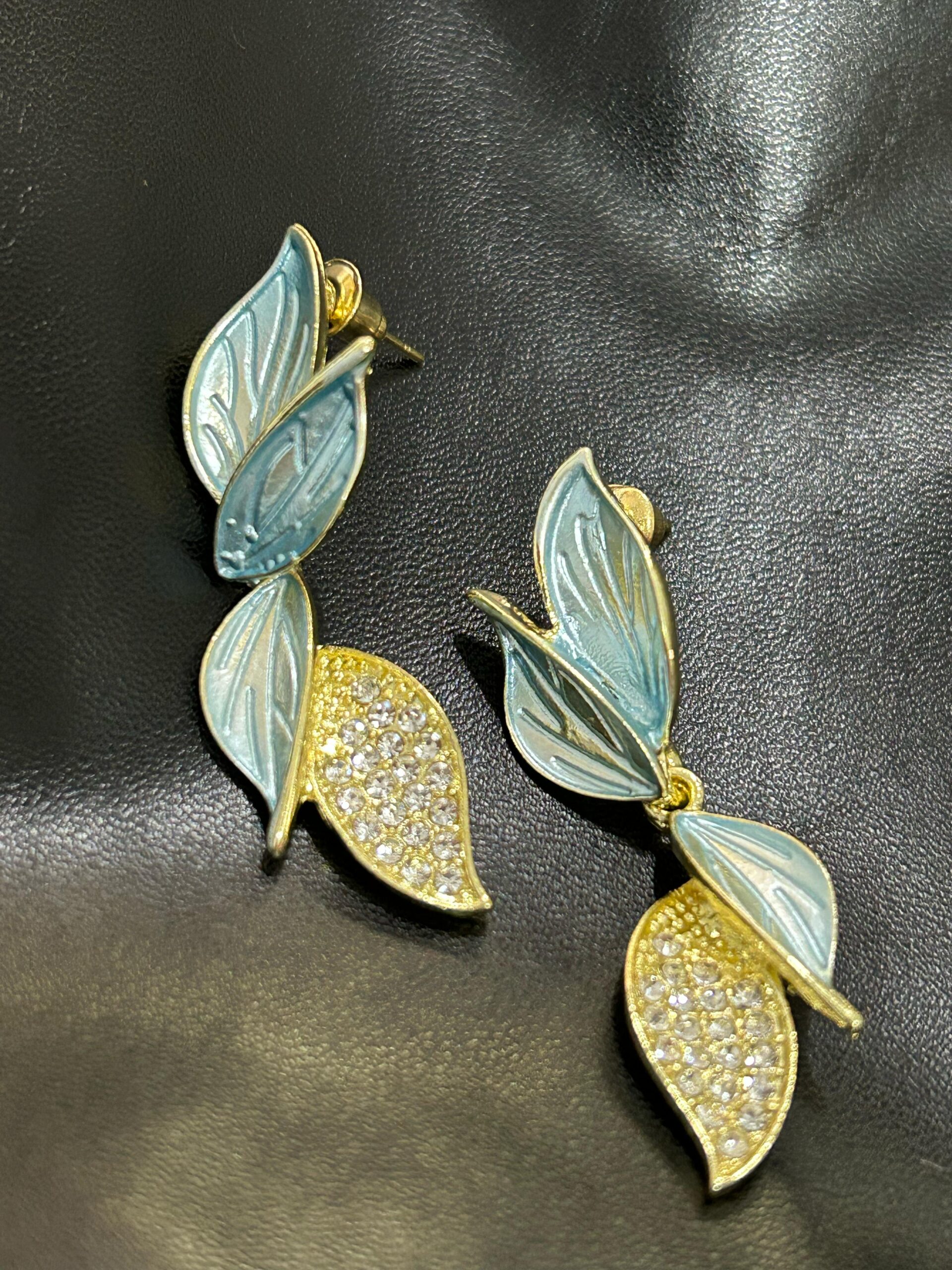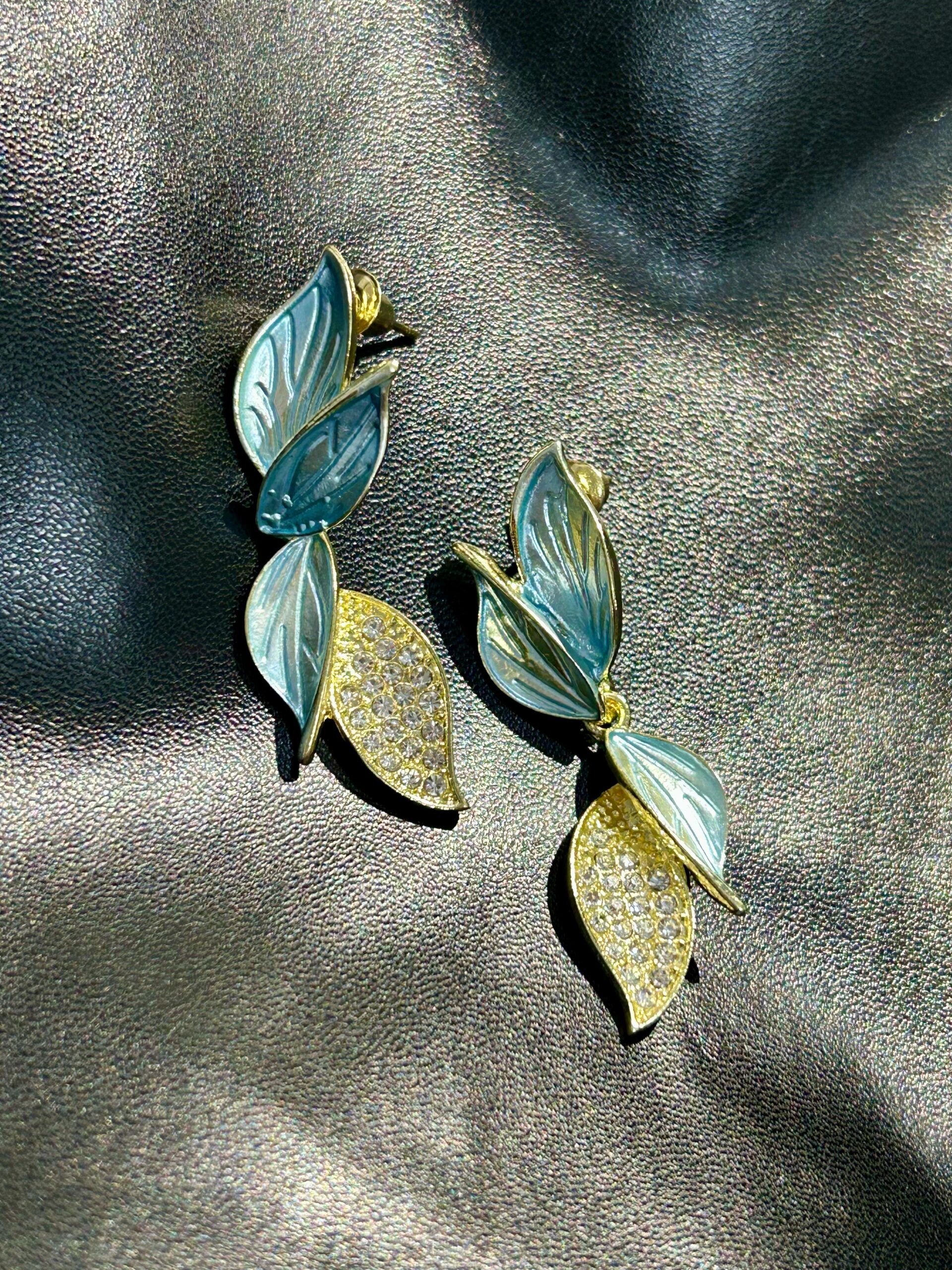 Simple. Elegant. Nature-chic. These Earrings feature a flowing leaf design in muted blue enamel and glimmering crystal accents.